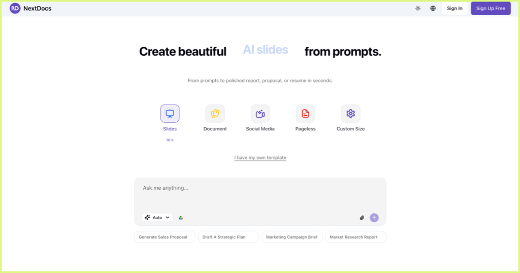 A newer but impressive player, NextDocs.io has earned praise for its intuitive user experience and strong AI slide generation.