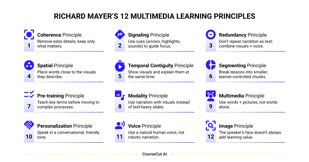 In this blog, we’ll break down each principle in plain language — with practical takeaways for teachers, course creators, and L&D teams.